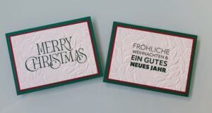 Dies ist eine Weihnachtskarte in zwei Varianten. Der Prägefolder kam noch rechtzeitig zum Start der Produktion. Klassisch in Rot und Grün, ein bisschen Vintage in Vanille. Ich wünsche Euch allen ein Frohes Fest und ein schönes Neues Jahr....