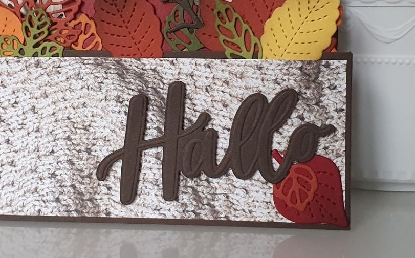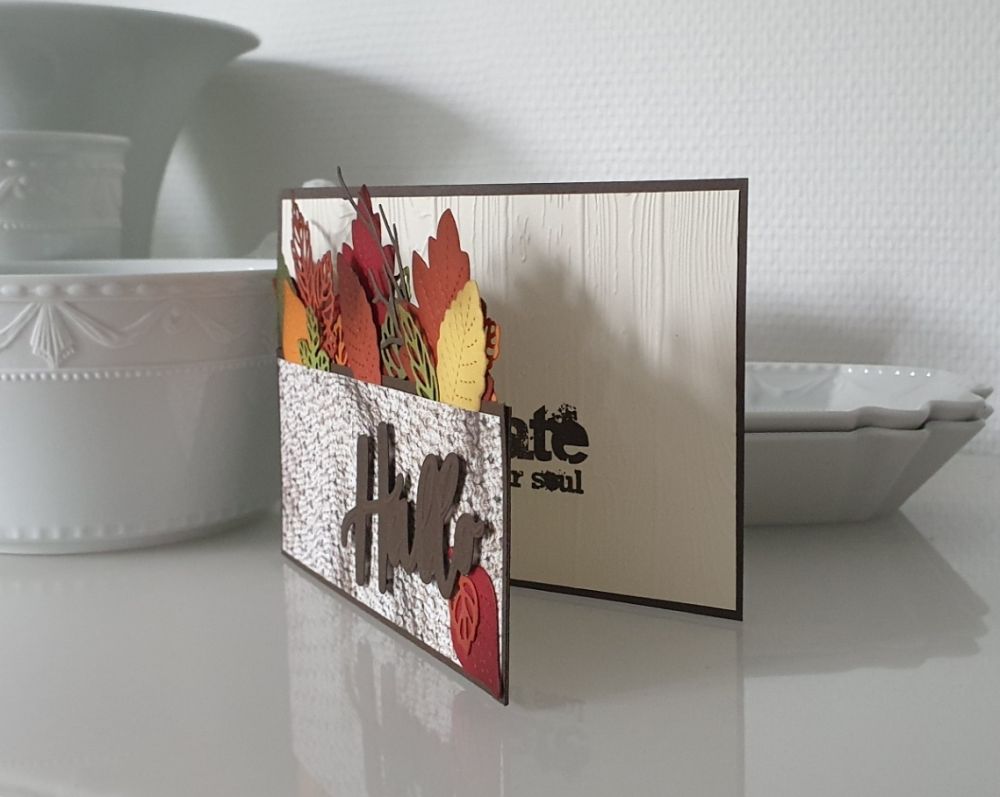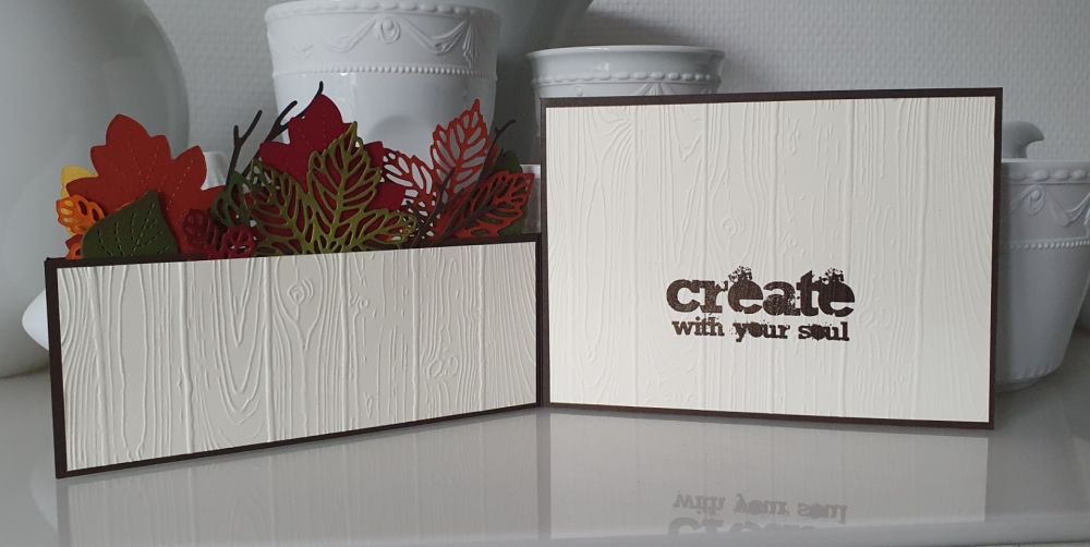 Nun habe ich wieder etwas mehr Zeit. Da wir noch tiefer im Herbst sind, fand ich eine Karte mit Herbstlaub der Jahreszeit entsprechend. Auch Holzprägung und Designerpapier mit einem gestrickten Teil fand ich durchaus passend. Ich stricke zur Zeit einen Schal mit Ärmeln, das Papier hat mich umso mehr angesprochen.