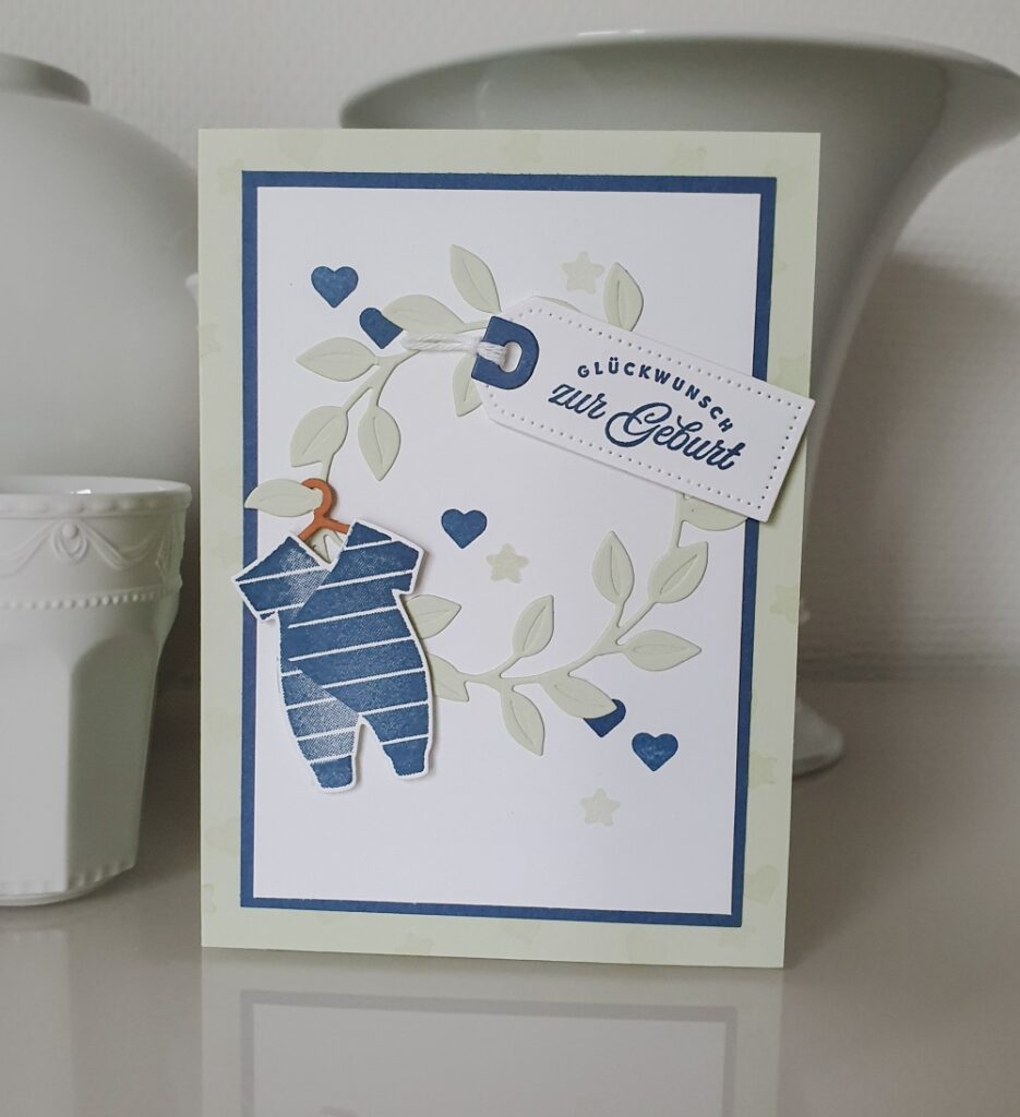 Der Auftrag lautete: Eine Willkommenkarte für einen kleinen Jungen in Blau. Die Idee zur Ausgestaltung war schnell da. Ein Kranz an den der Strampler und die Glückwünsche direkt "angehängt" werden. Der Kranz ist farblich zurückhaltend, der Strampler darf dann aber...