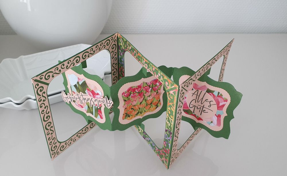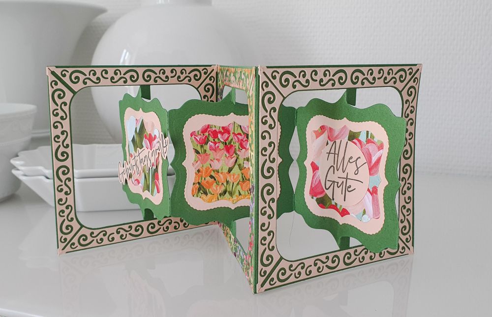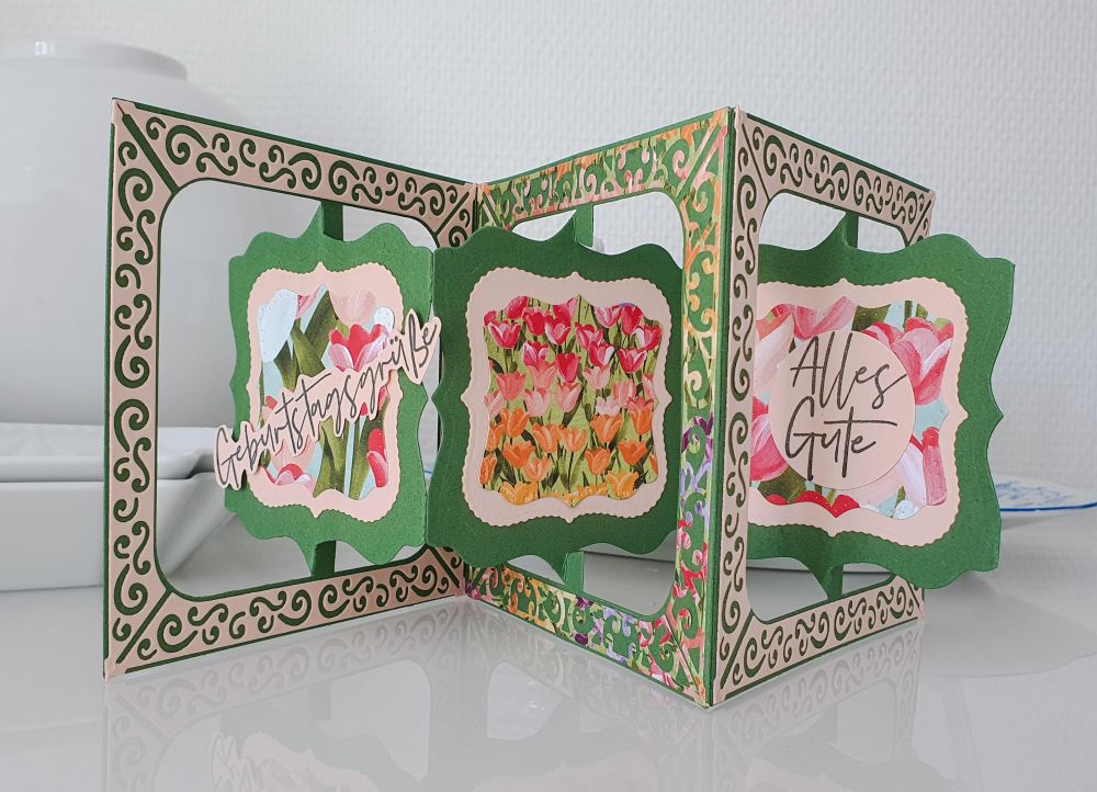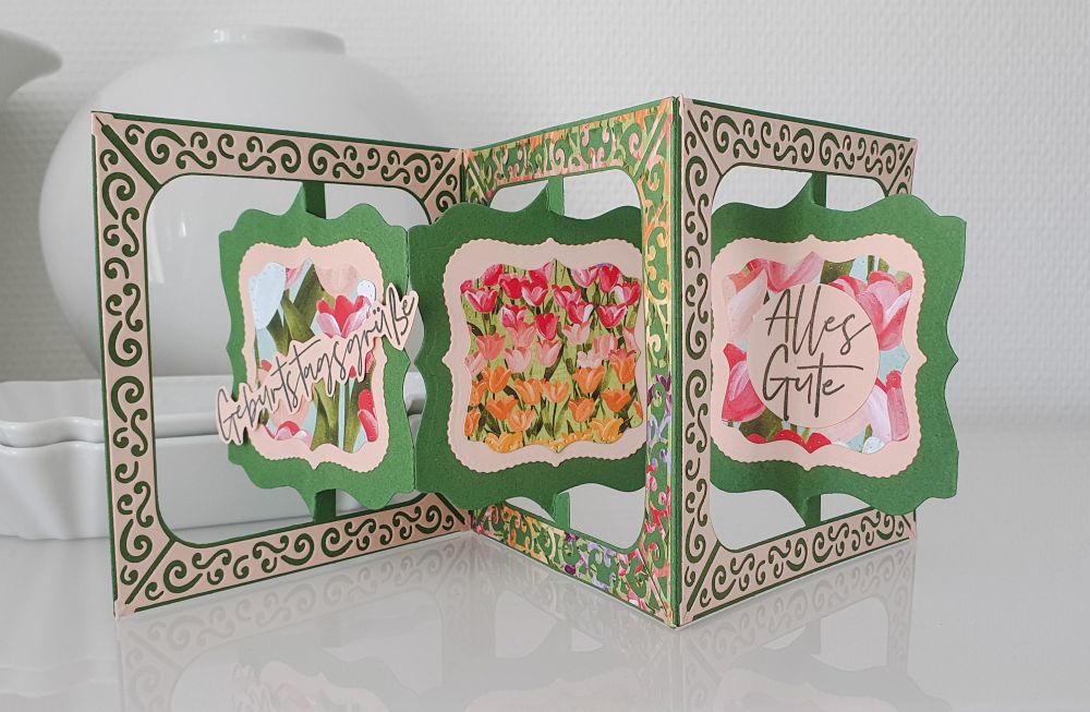 Die Kartenform wurde mit Stanzen von Karen Burniston erstellt. Die Stanze für die rosafarbene Mattung unter den Tulpen ist von Spellbinders. Unbeauftragte Werbung für beides.